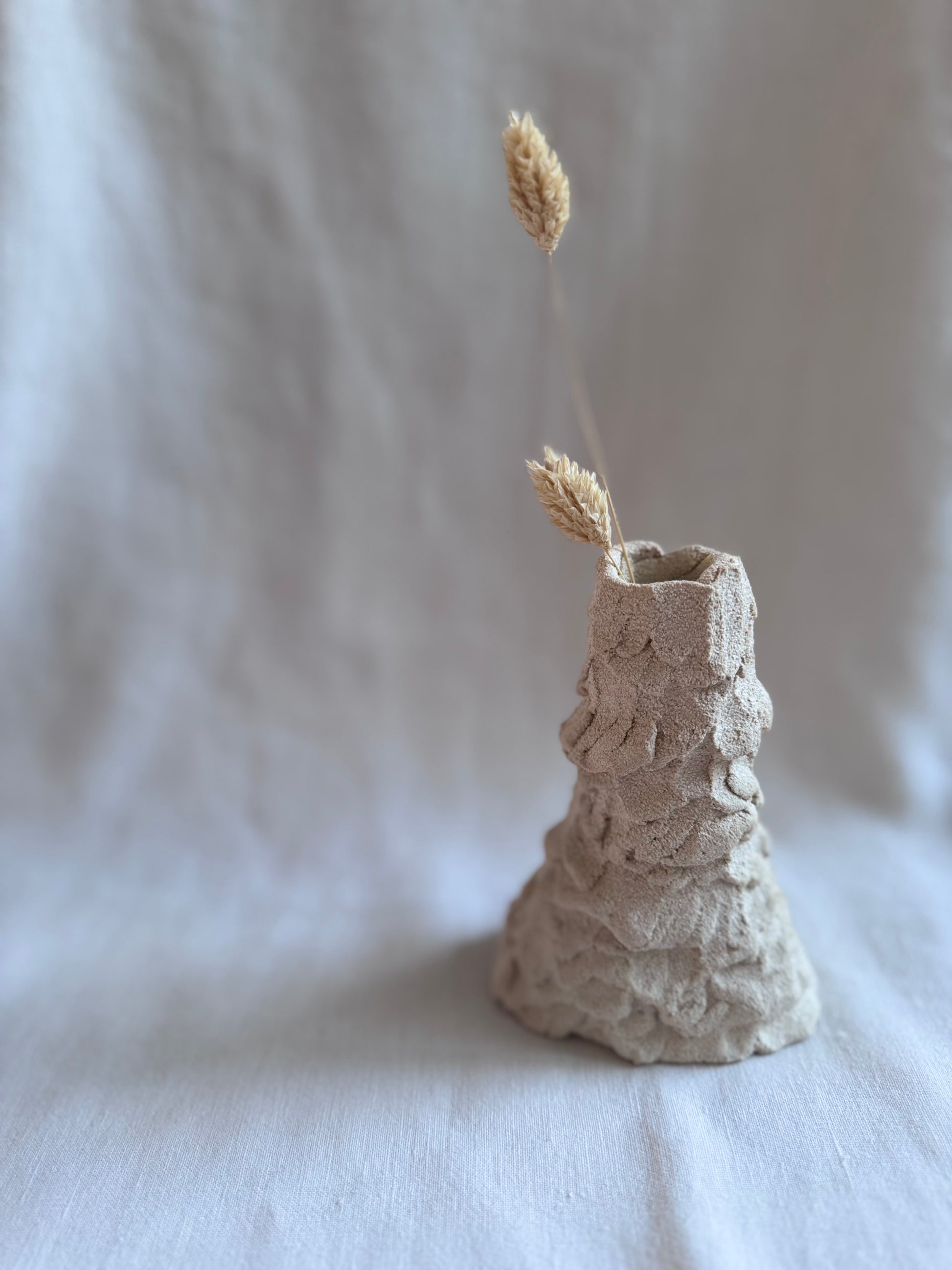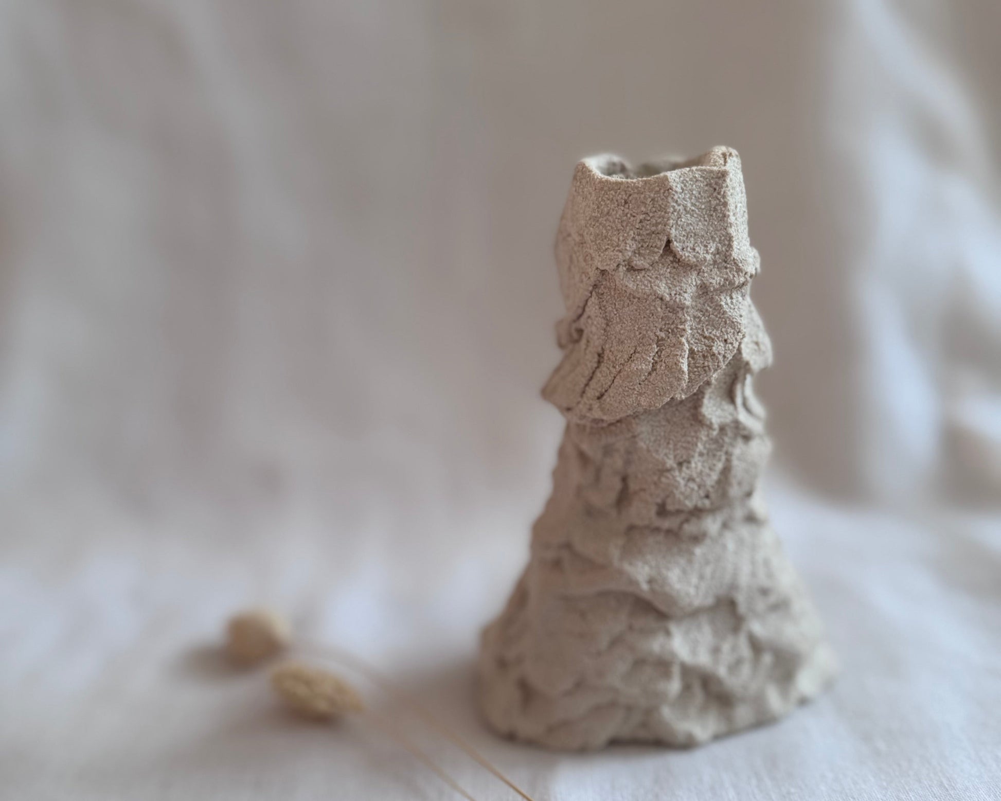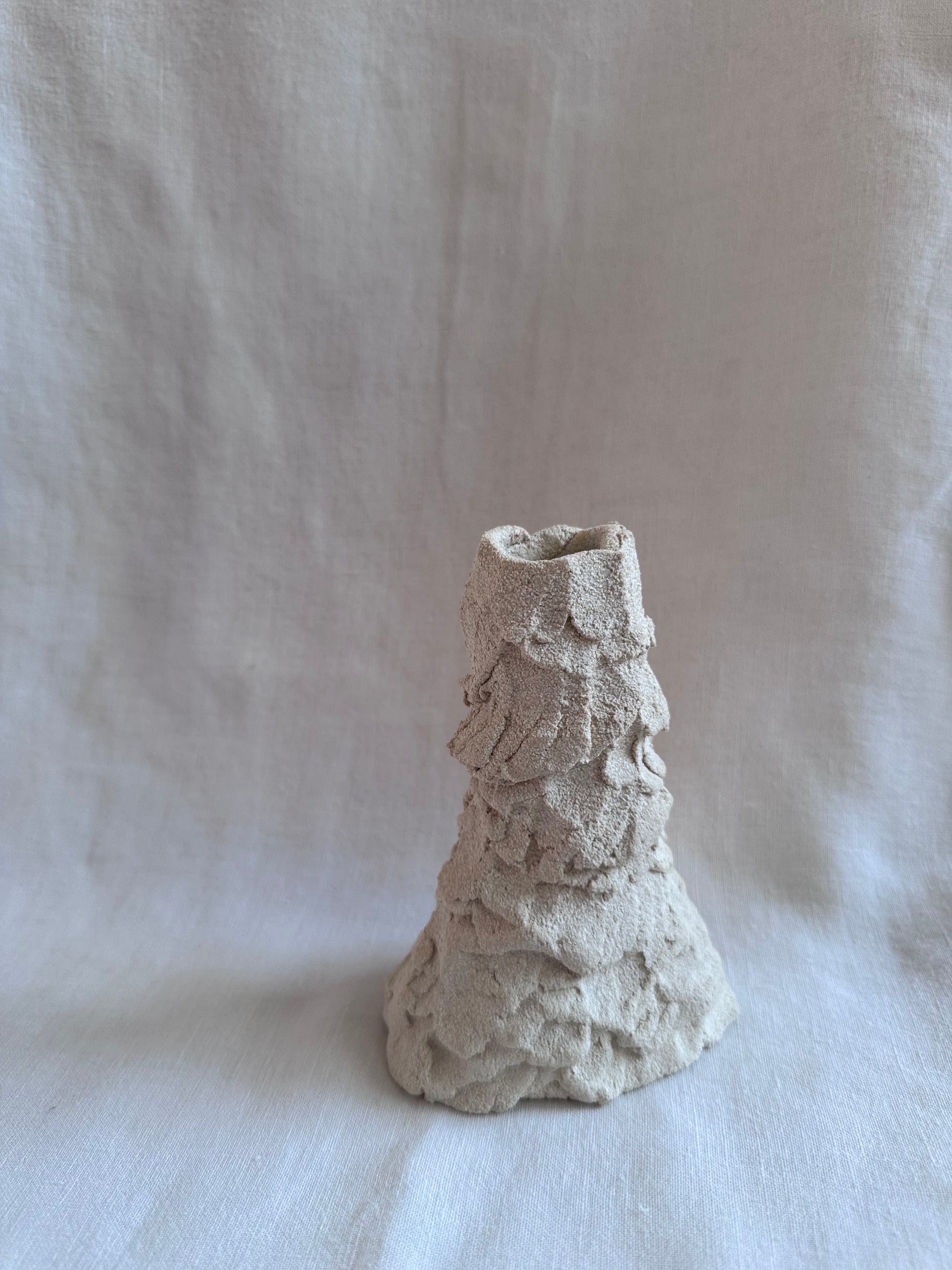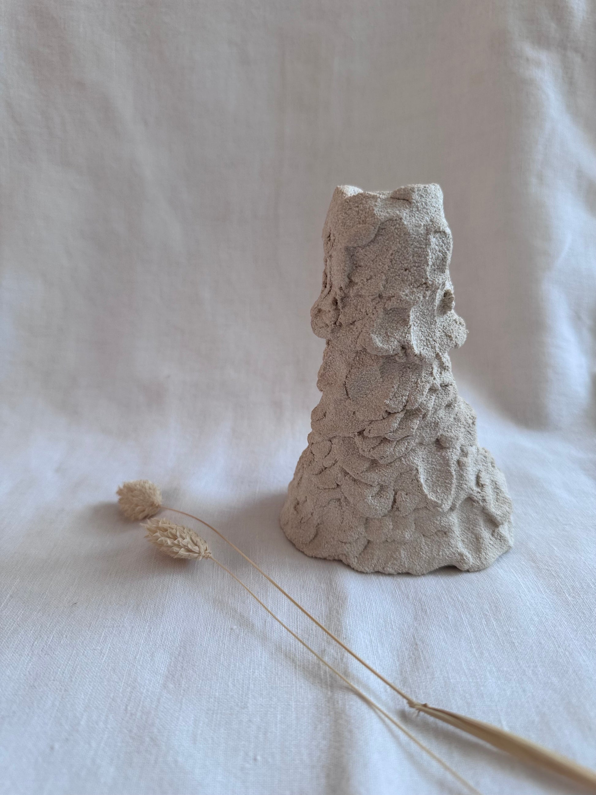 Sa surface brute et irrégulière évoque une matière minérale, presque rocheuse. Pensé comme un objet libre, il peut accueillir une bougie ou quelques fleurs séchées.