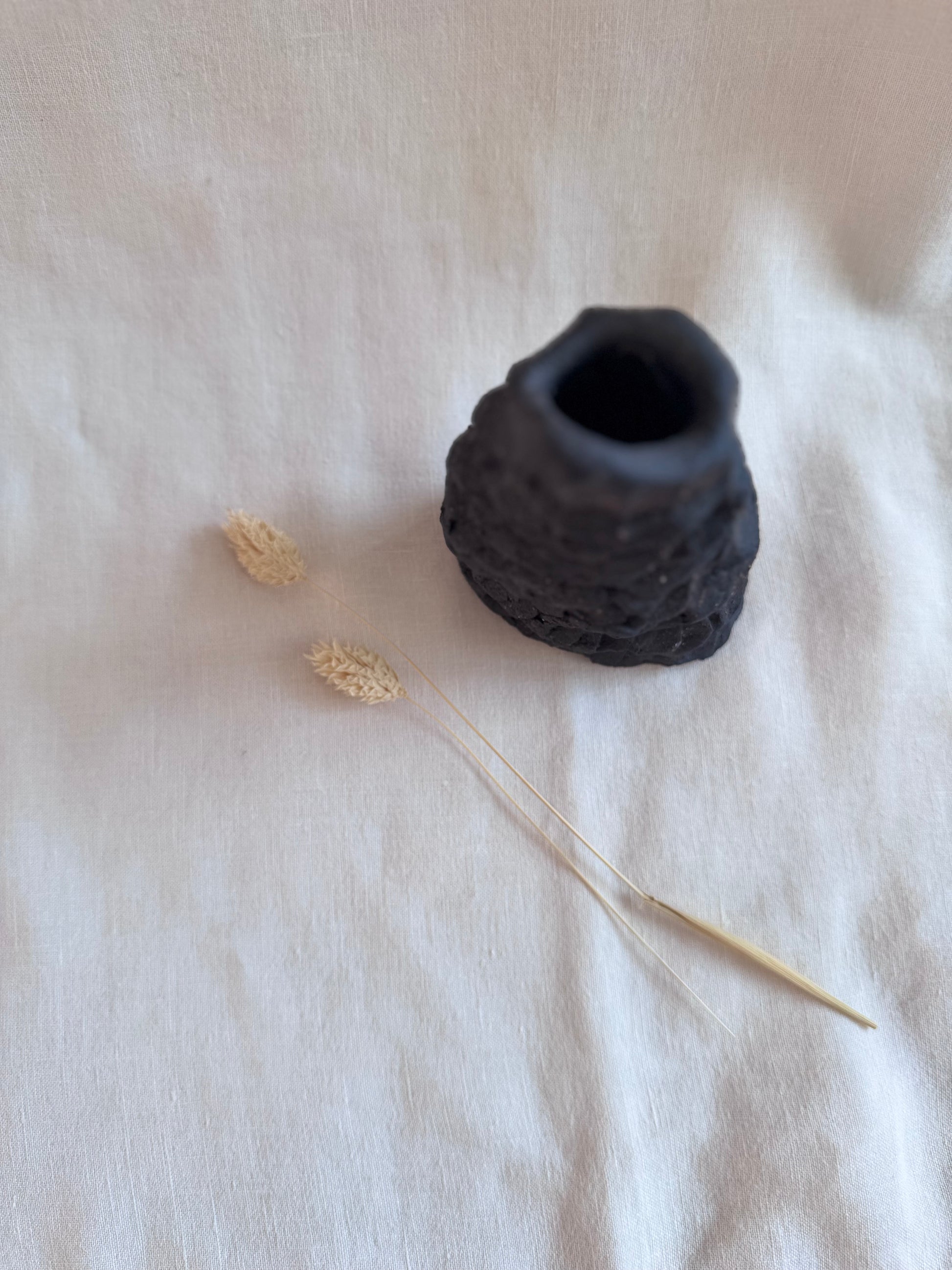 Réalisé à la main par l’artiste Astérisque dans son atelier de Cabo de Gata, en Espagne, ce bougeoir en grès noir est une pièce unique.