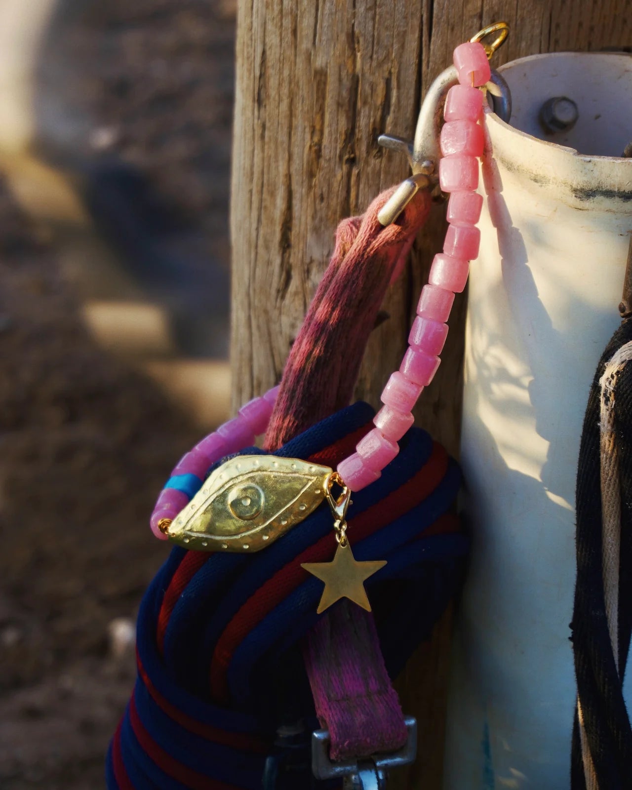 Le collier Big Fame joue avec les symboles de la reconnaissance et du désir. L’œil et l’étoile, réalisés en laiton plissé doré, dialoguent avec des perles en verre soufflé à la main pour composer une pièce à la présence affirmée, à la fois graphique et symbolique.