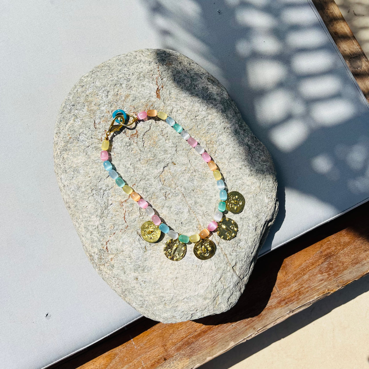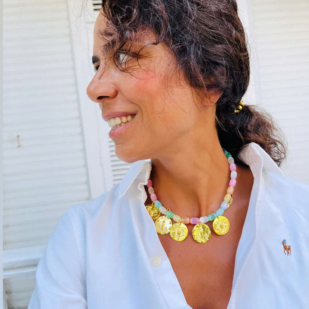 – Perles en nacre, corail, turquoise et sélénite multicolore