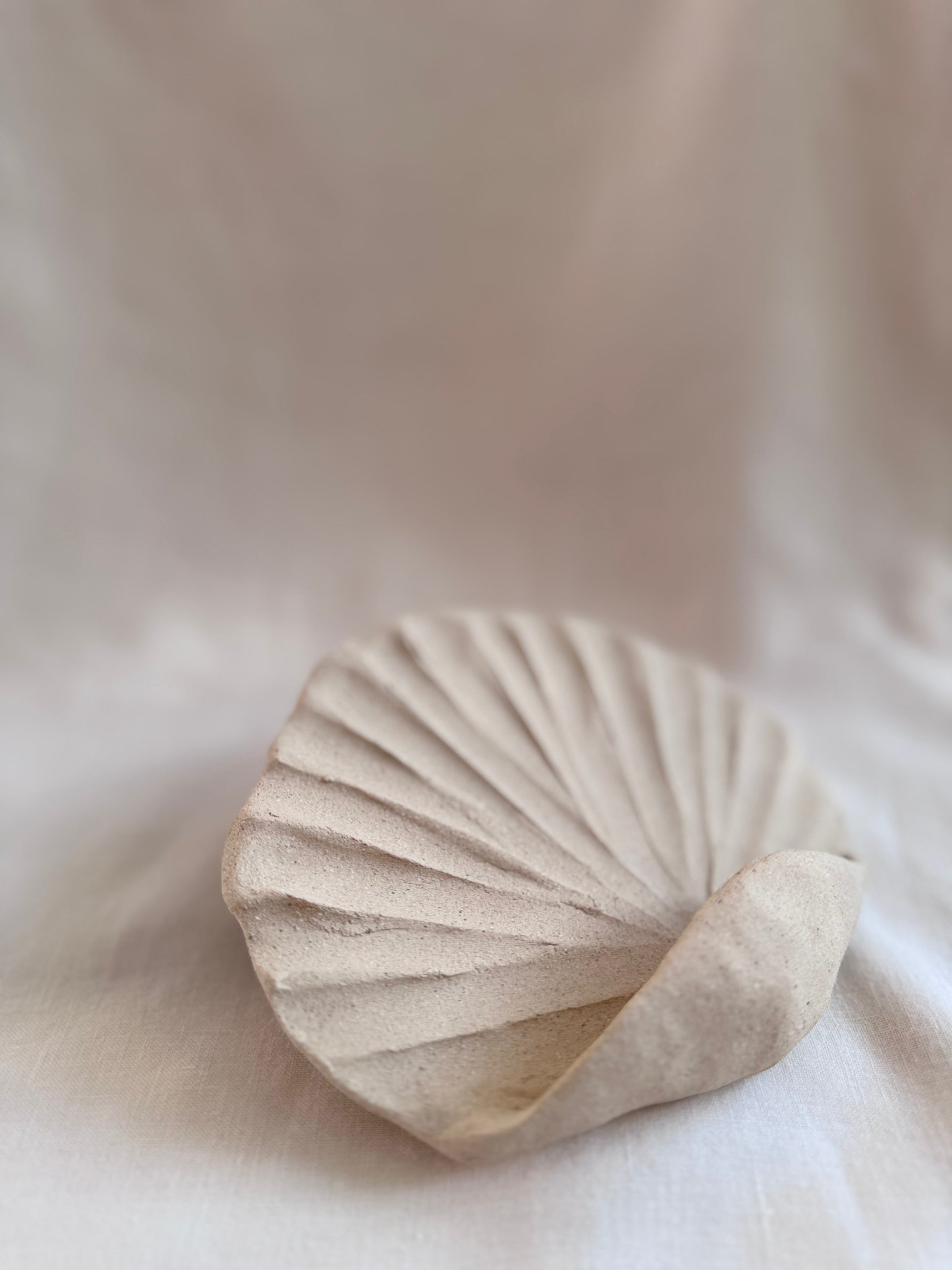 Façonné à la main au Portugal par Ayala Braidman, ce coquillage en grès blanc brut évoque une forme organique, entre désert et rivage.