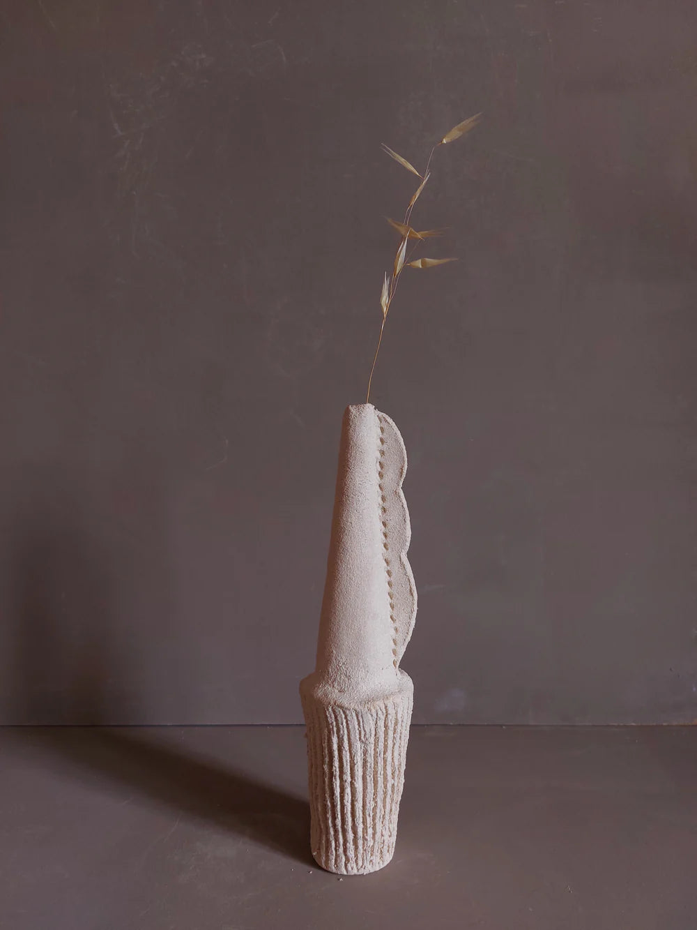 Sa forme verticale et texturée évoque une forme presque totémique. Non étanche, il est pensé pour accueillir une tige ou s’exposer seul comme un objet sculptural.