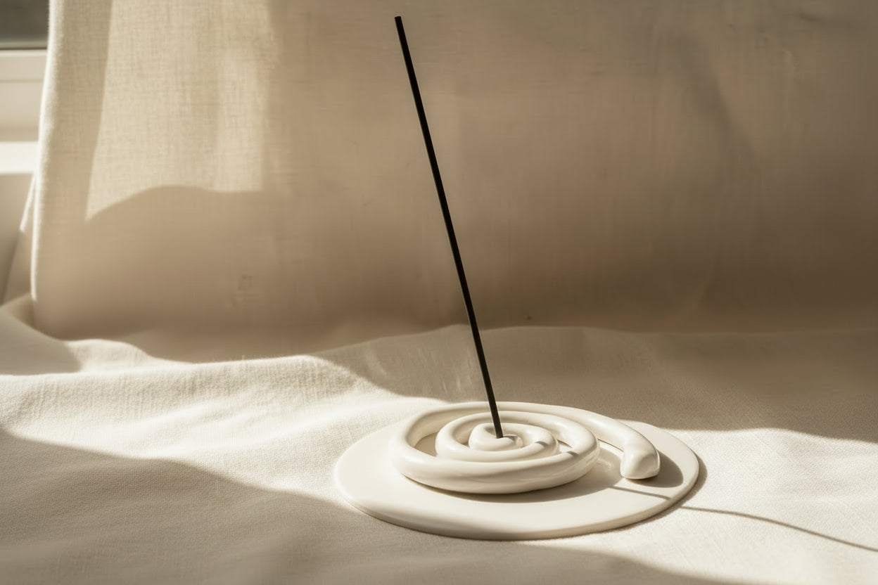 Le porte-encens serpent, pièce façonnée à la main, prolonge cette approche sensible. Symbole ancien du soleil spirituel et gardien des forces vitales, il accueille chaque bâton avec équilibre, laissant la fumée s’élever librement.